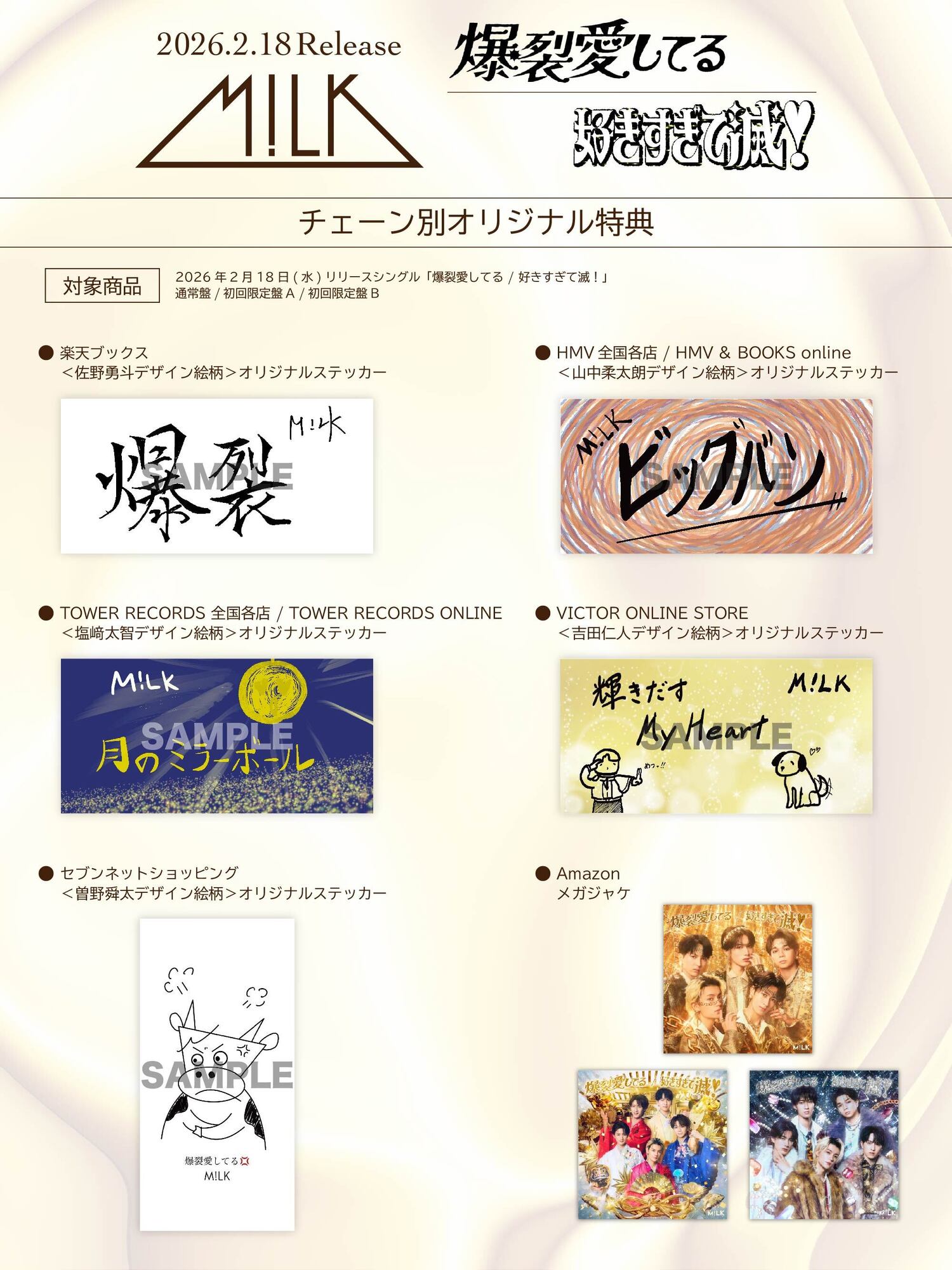 対象チェーン店舗・オンラインストアにて、M!LKシングル「爆裂愛してる / 好きすぎて滅!」を受付期間中にご予約いただいた方に、『M!LKオリジナル2Lフォト(全3種ランダム1枚)』をプレゼントいたします。期間限定ですので、お早めにご予約ください。