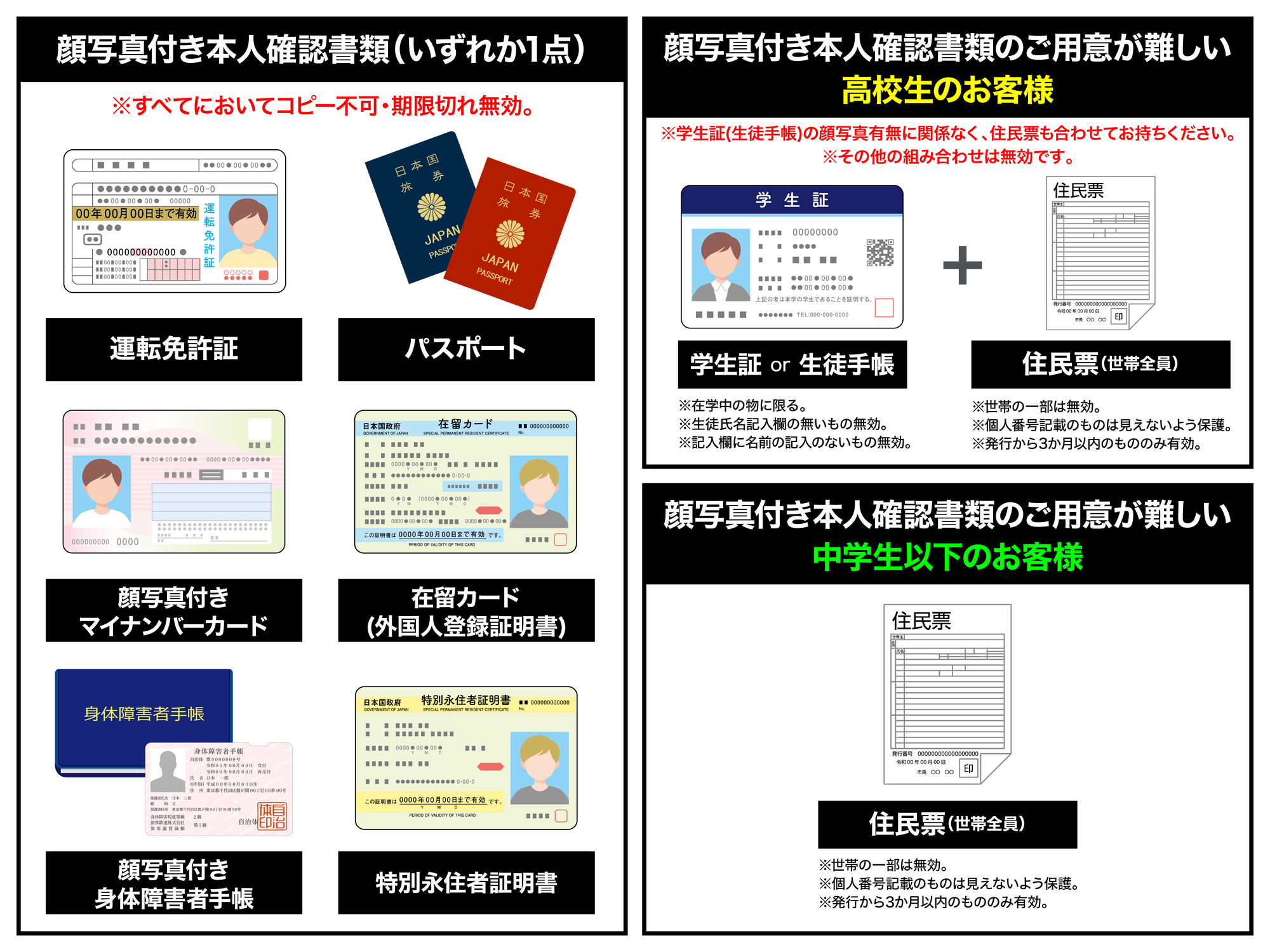 入場時に本人確認書類(コピー不可・原本のみ有効・期限切れ無効)によるご本人様確認をさせていただきます。