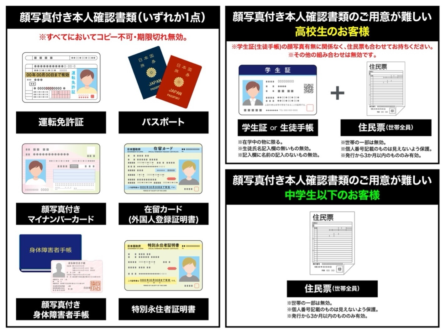 ※学生証 もしくは 生徒手帳の顔写真有無に関係なく、住民票も合わせてお持ちください。