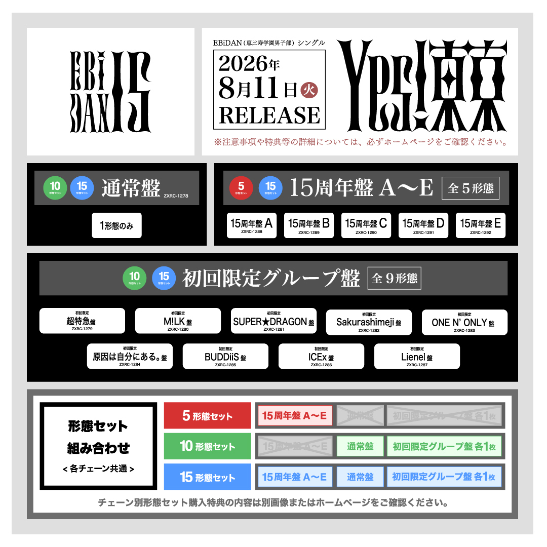 なお、15周年記念シングル「Yes! 東京」を期間内に予約すると配布されるシリアルナンバーでは、後日実施される『EBiDAN THE LIVE 2026 15th Anniversary』チケットのCDシリアル先行(抽選)にご参加いただけます。