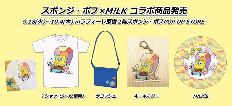 海底都市“ビキニタウン”に住む人気者スポンジ・ボブと大人気ボーカルダンスユニットM!LKのコラボ商品が 、9月18日~10月4日までラフォーレ原宿2階スポンジ・ボブPOP UP STOREにて発売決定!