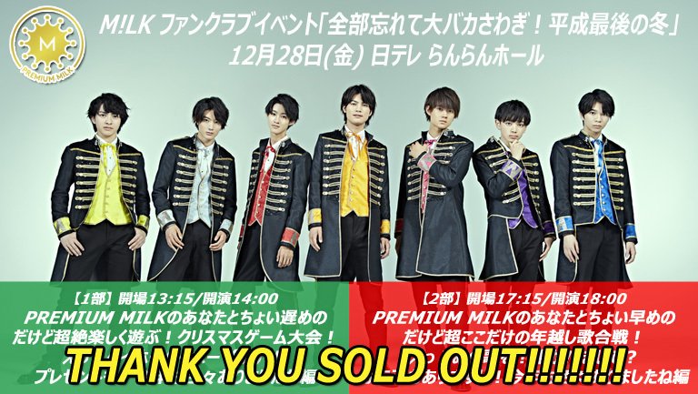12/28(金)日テレ らんらんホールで開催される、M!LKファンクラブイベント「全部忘れて大バカさわぎ!平成最後の冬」のチケットがすべて完売致しました!