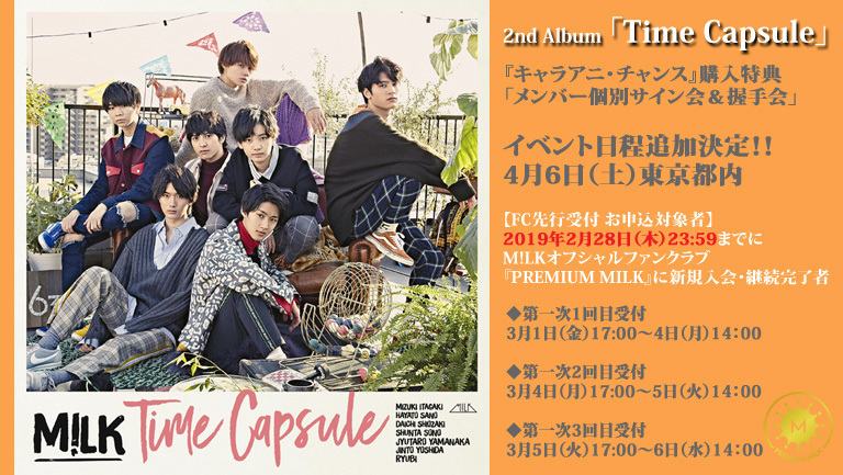 M!LK 2ndアルバム『Time Capsule』(「メンバー個別サイン会&握手会」参加券付)キャラアニ・チャンスでの販売詳細ご案内