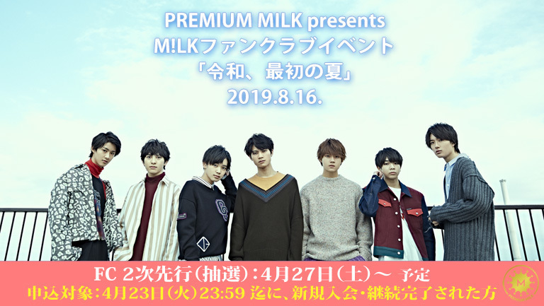 8月16日(金)なかのZERO 大ホールにて開催の、M!LKのファンクラブイベント「令和、最初の夏」PREMIUM MILK 会員2次先行受付が決定しました!