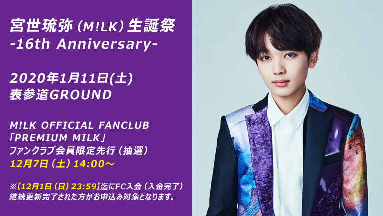 2020年1月11日(土)表参道GROUND にて、M!LKオフィシャルファンクラブ「PREMIUM MILK」会員限定の「宮世琉弥 生誕祭」の開催が決定しました!