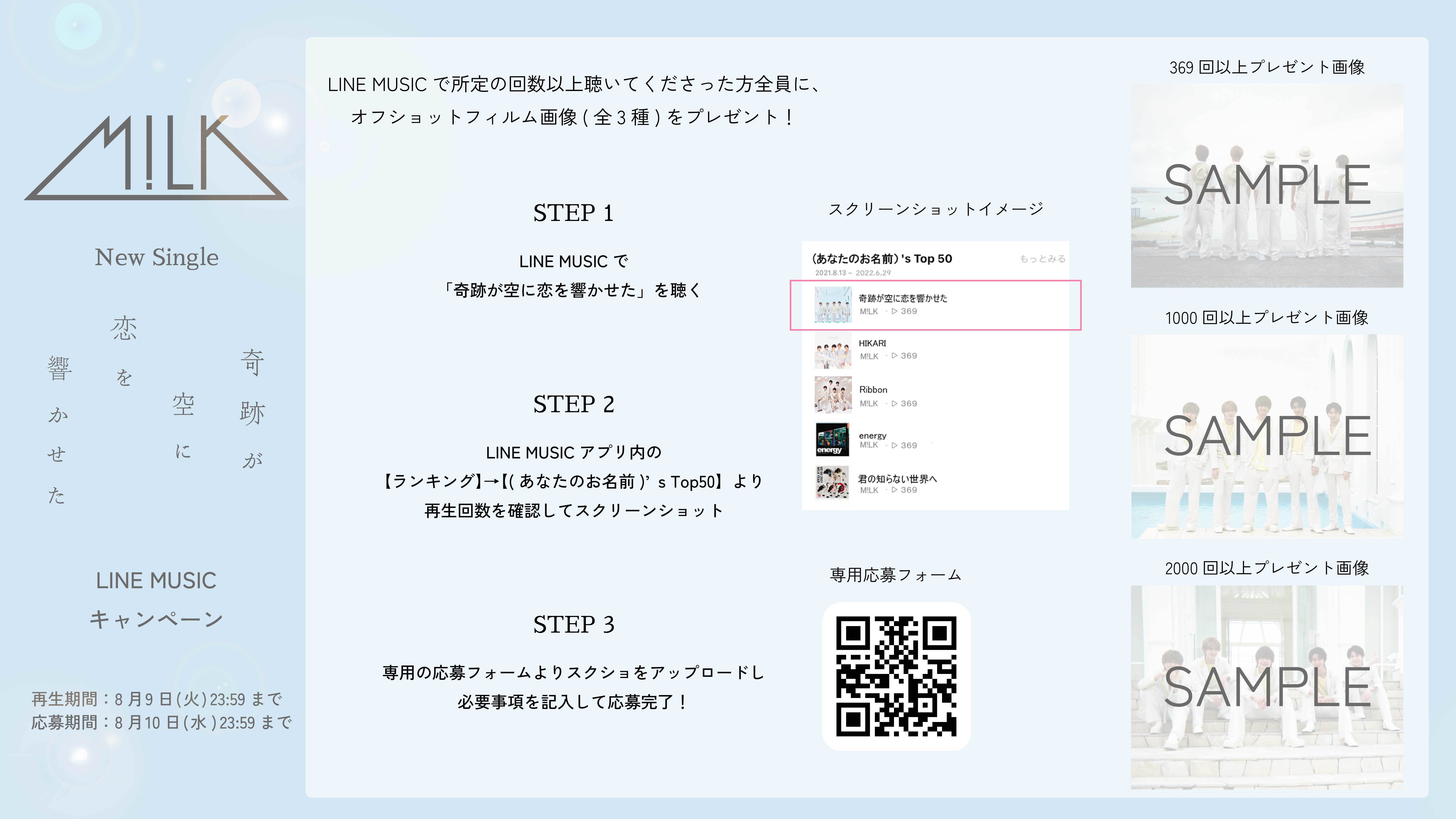 期間中に「奇跡が空に恋を響かせた」をLINE MUSICで369回以上、1000回以上、2000回以上聴いてくださった方にもれなく