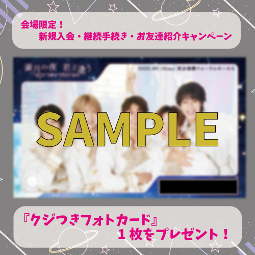 当日ファンクラブブースにて、新規ご入会もしくは、既存会員様からのご紹介で新規ご入会いただくと、ご入会者様と既存会員様それぞれに『クジつきフォトカード』1枚をプレゼント!