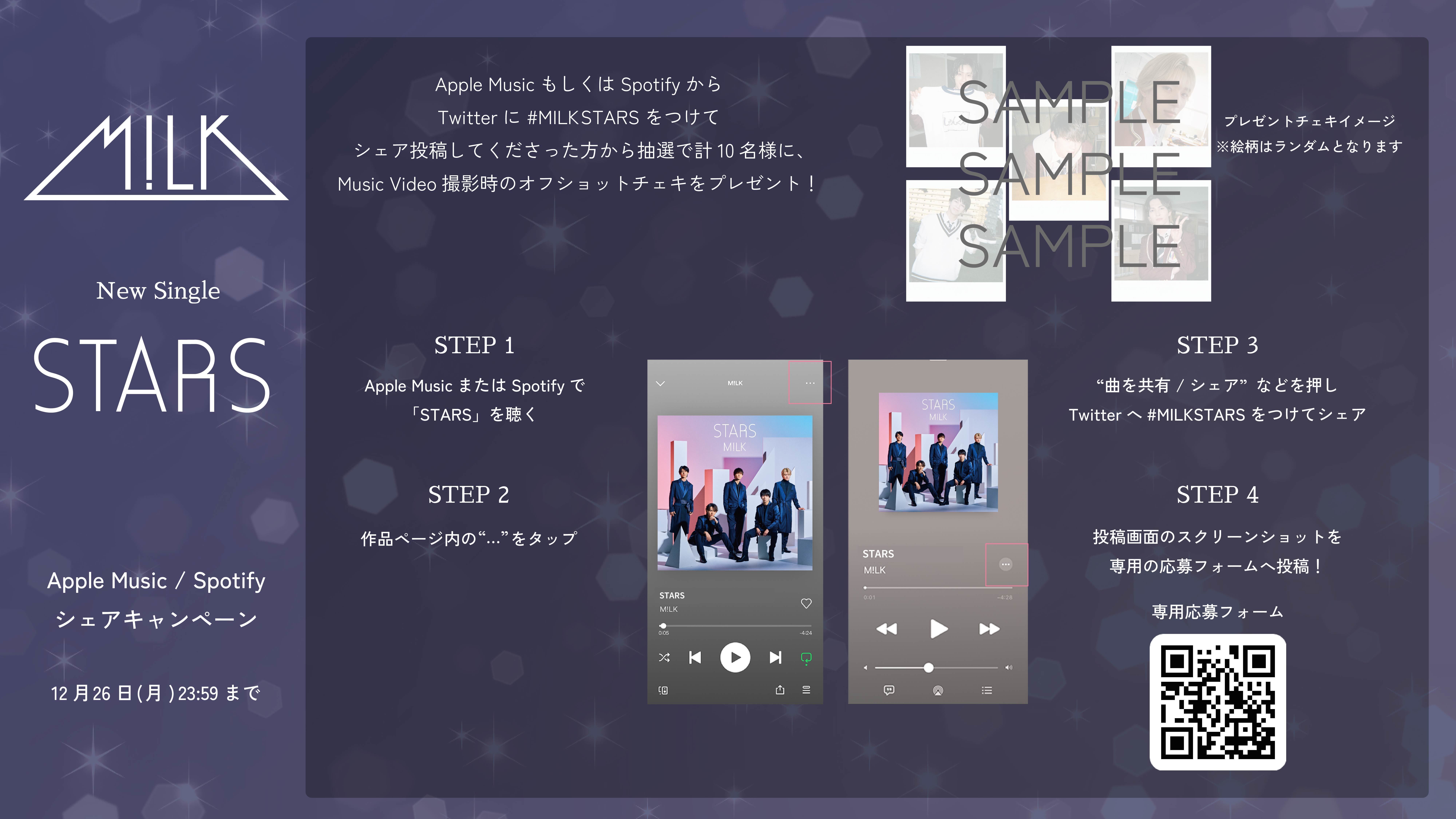 11月28日(月)より先行配信されるM!LK「STARS」をApple MusicもしくはSpotifyで再生し、ハッシュタグ#MILKSTARSをつけてTwitterで楽曲の感想とともにシェア投稿してくださった方の中から抽選で各5名様に【M!LK学園のランダムソロオフショットチェキ】をプレゼントします!