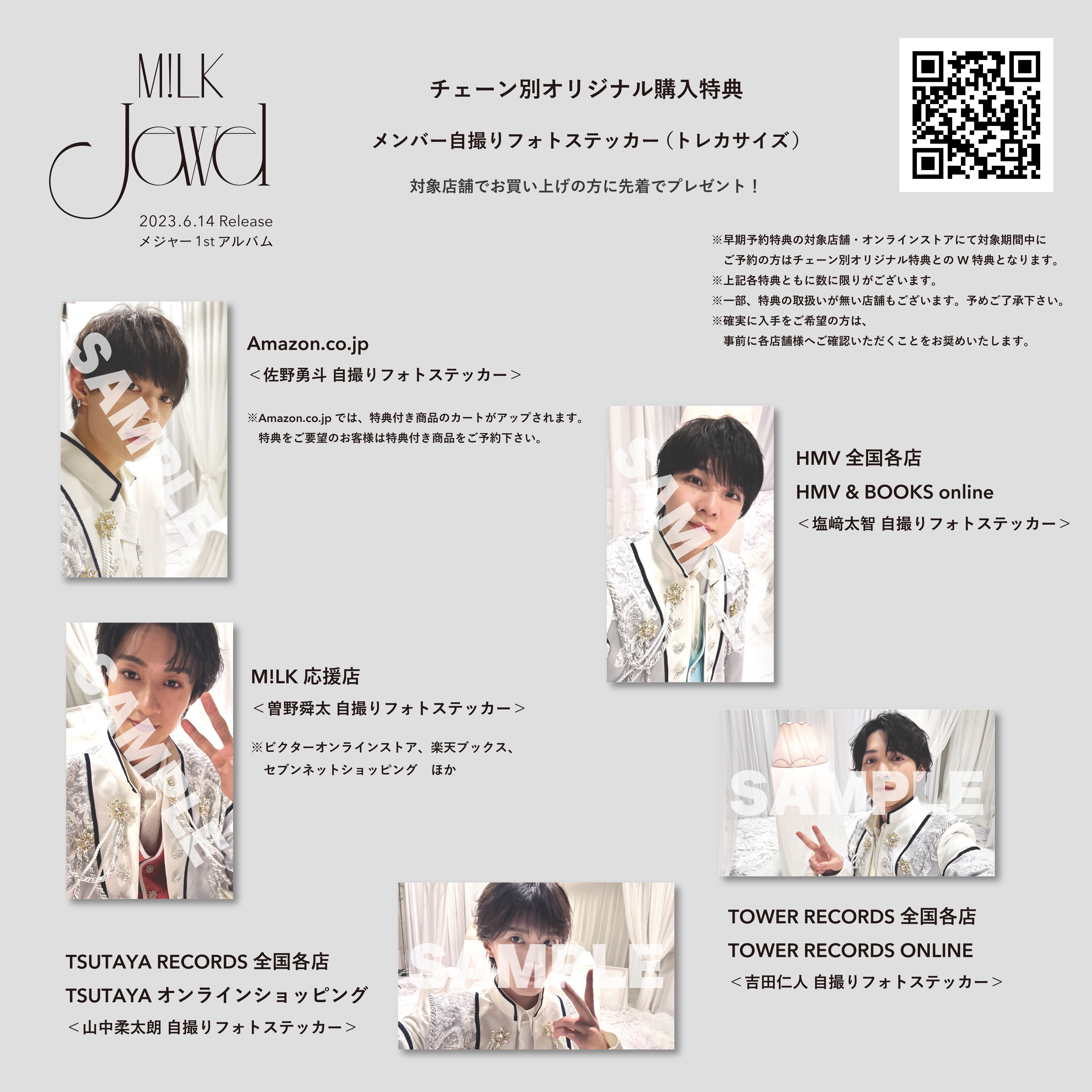下記チェーン店舗・オンラインストアにてM!LK メジャー1stアルバム「Jewel」をお買い上げの方に、『メンバー自撮りフォトステッカー(トレカサイズ)』を先着でプレゼント致します。各特典ともに数に限りがございますので、お早めにご予約・お買い求めください。