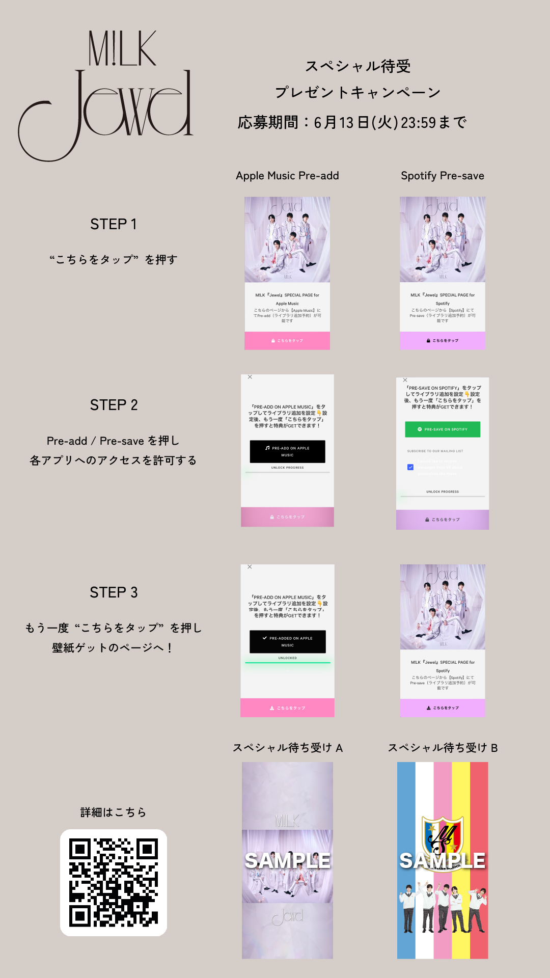 6月14日(水)配信M!LK『Jewel』を、リリース前日までにPre-add(Apple music)をしてくれた方全員にスペシャルスマホ待ち受けAをプレゼント!また、リリース前日までにPre-save(Spotify)をしてくれた方全員にスペシャルスマホ待ち受けBをプレゼント!