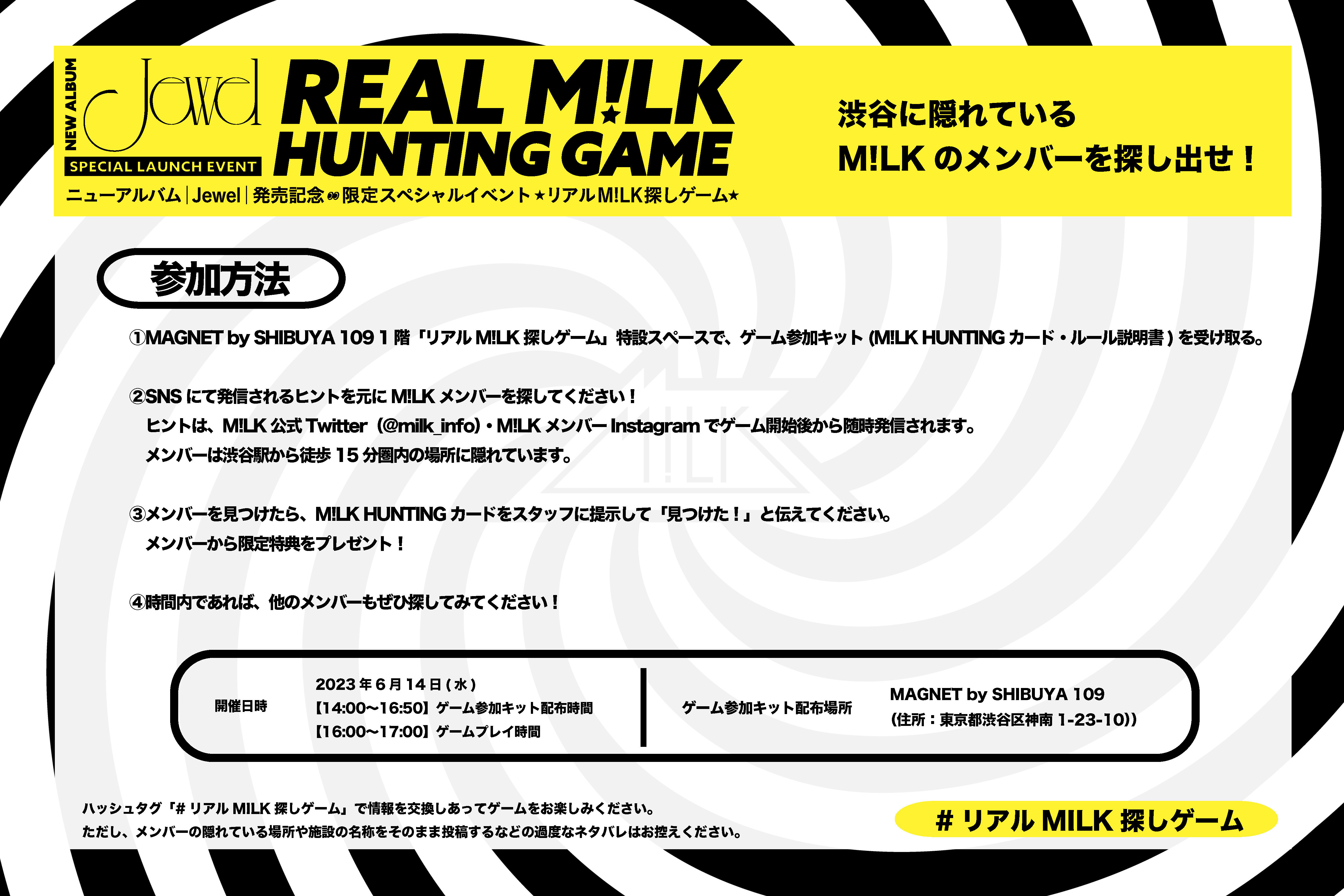 ハッシュタグ「#リアルMILK探しゲーム」で情報を交換しあってM!LK探しをお楽しみください。