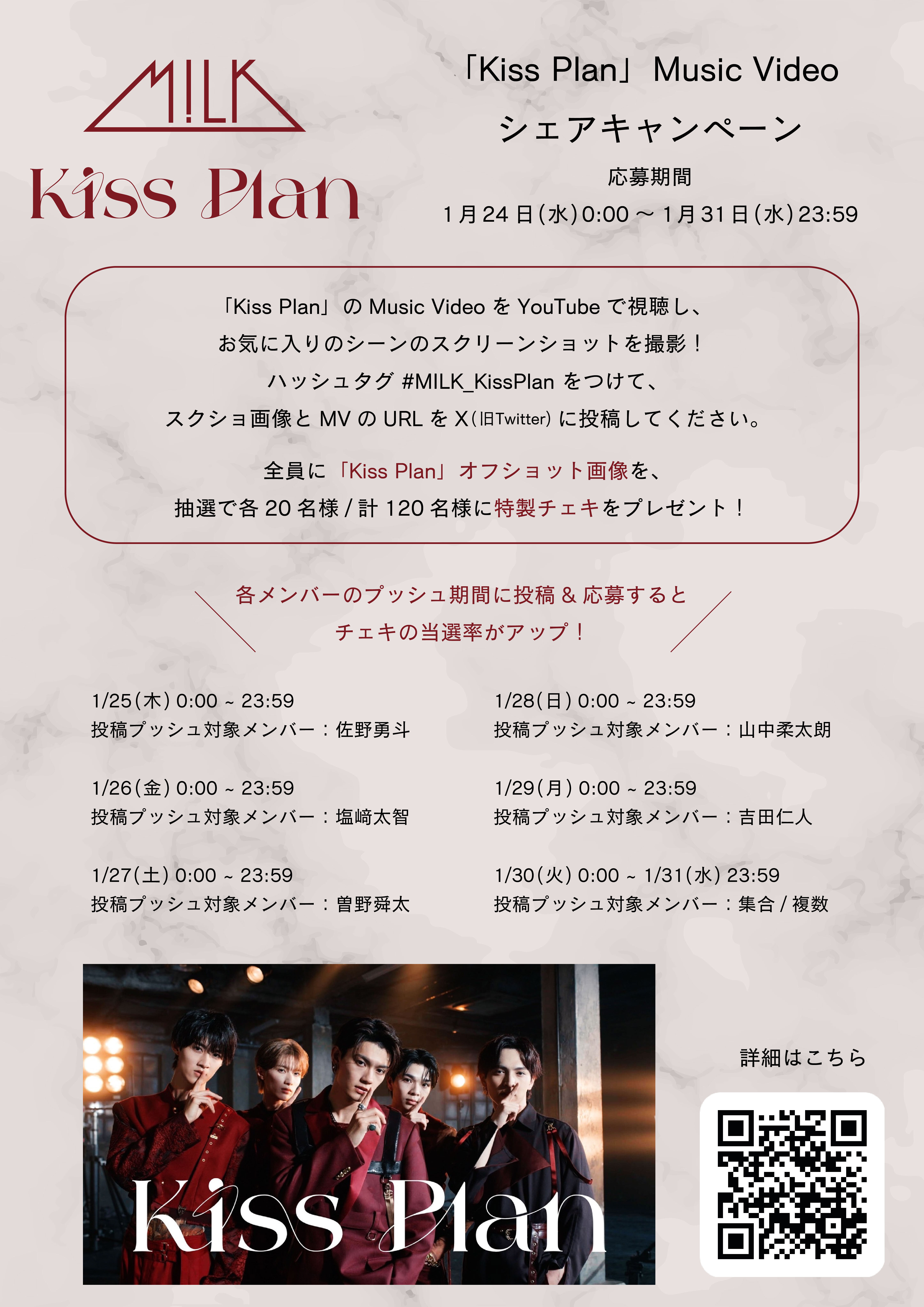 ハッシュタグ #MILK_KissPlan をつけて、スクリーンショット画像とMusic VideoのURLをX(旧Twitter)に投稿してください!