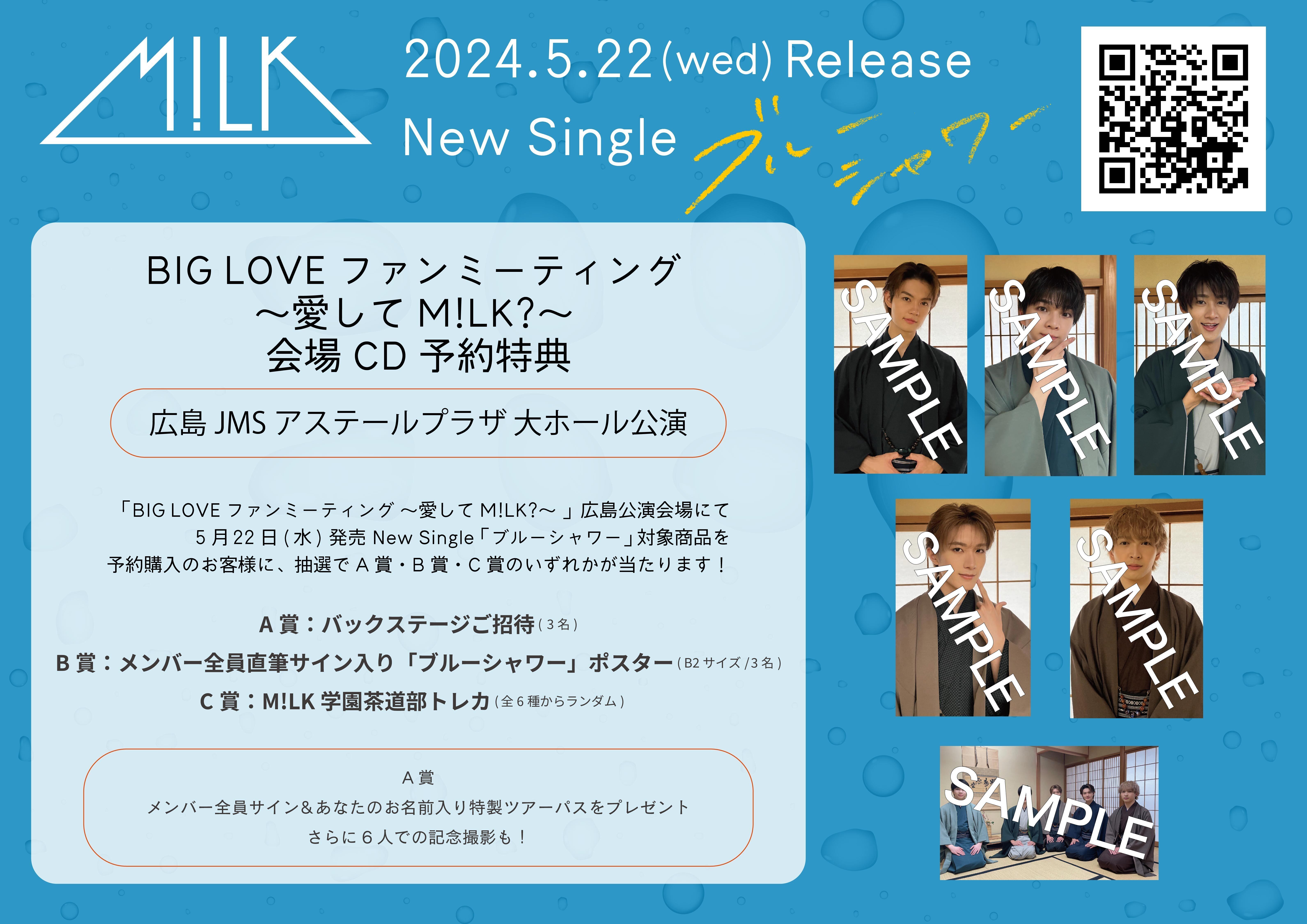 ※当日終演後の抽選に関しまして、B賞:メンバー全員・直筆サイン入り「ブルーシャワー」非売品ポスターとC賞:「M!LK学園茶道部トレカ」現地でのお渡しとなりますのみとなります。