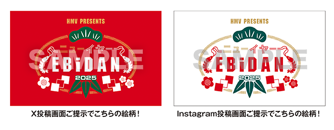 「#ニューイヤーEBiDAN」のハッシュタグをつけて、XもしくはInstagramにて投稿し、投稿画面をHMV店頭レジでご提示いただくと、「ニューイヤーEBiDAN ロゴステッカー」を先着でプレゼント!