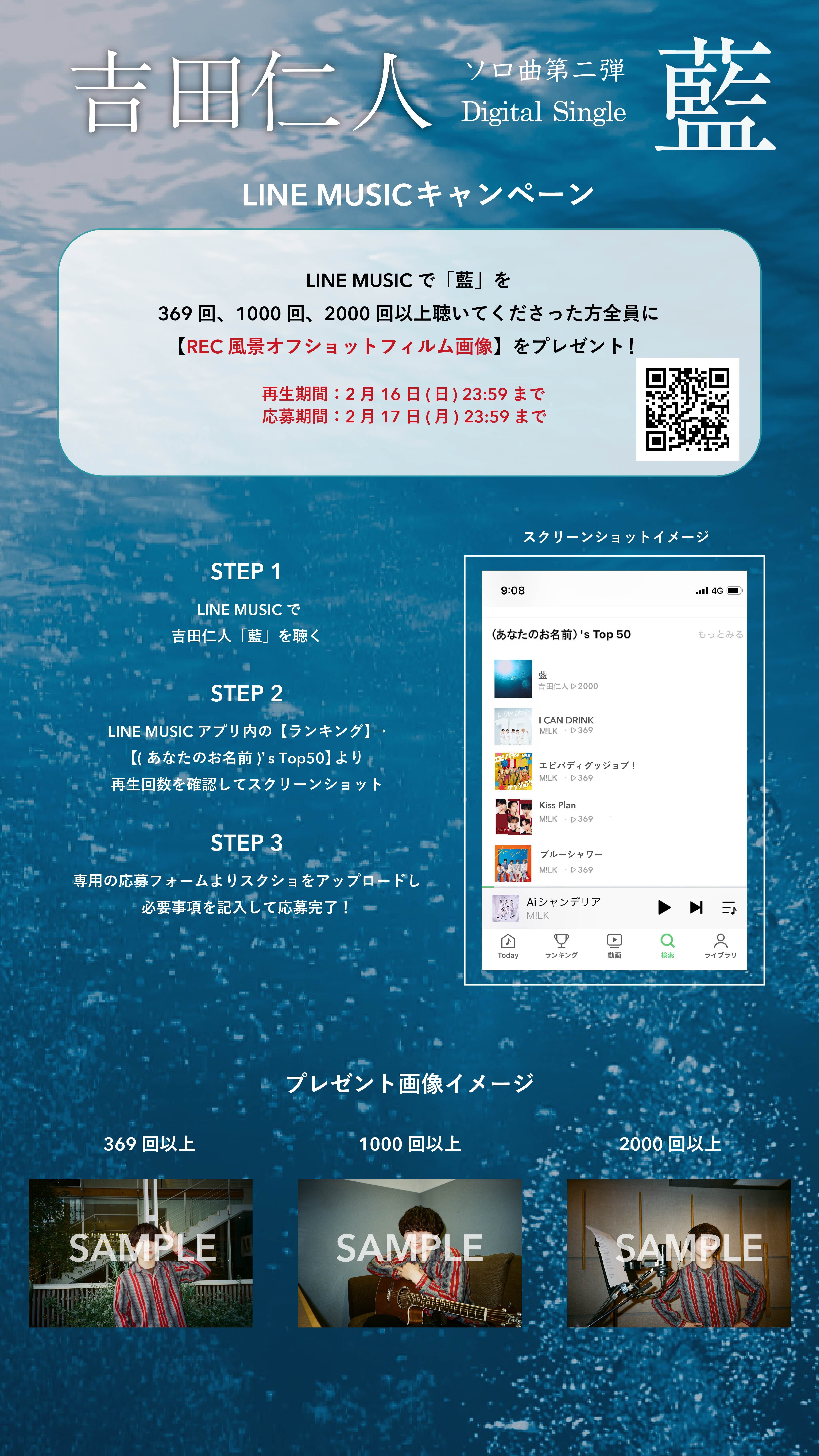 1月15日(水)の吉田仁人「藍」の配信スタートを記念して、「藍」のLINE MUSIC再生キャンペーンが決定しました!