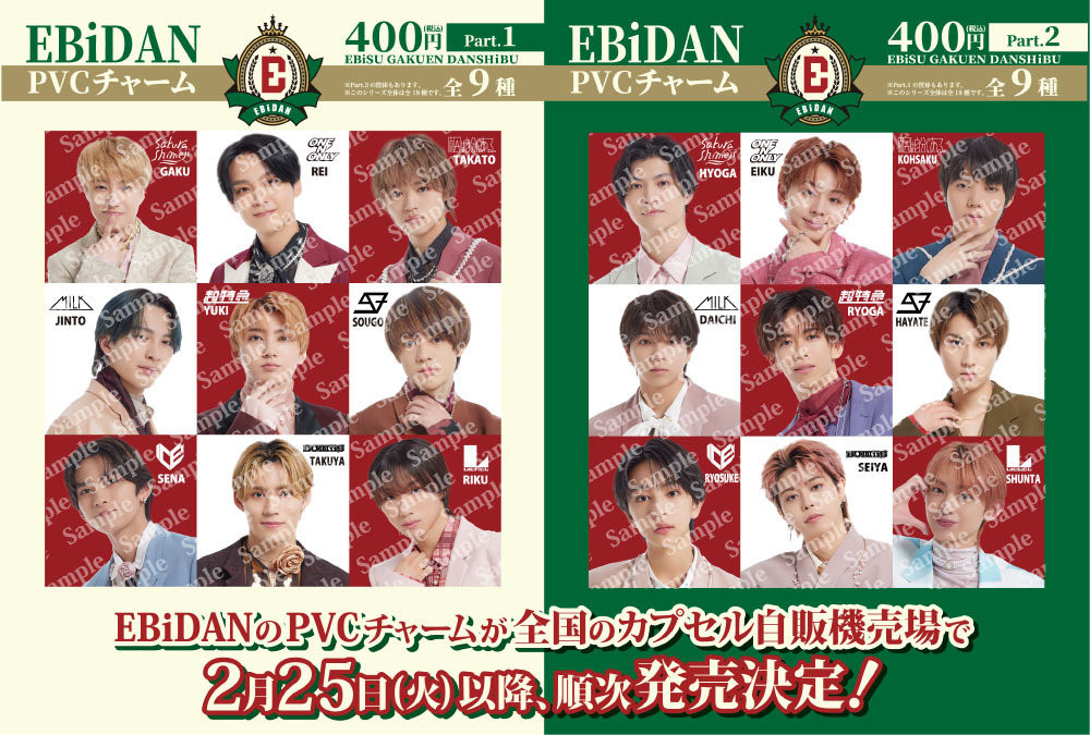 『EBiDAN PVCチャーム』は、Part.1とPart.2の筐体に分かれ、それぞれ9種類全18種類が、全国の HMV(20店舗)、gashacoco(ガシャココ)、ガシャポンのデパートほか、カプセルトイコーナーにて同時発売されます。