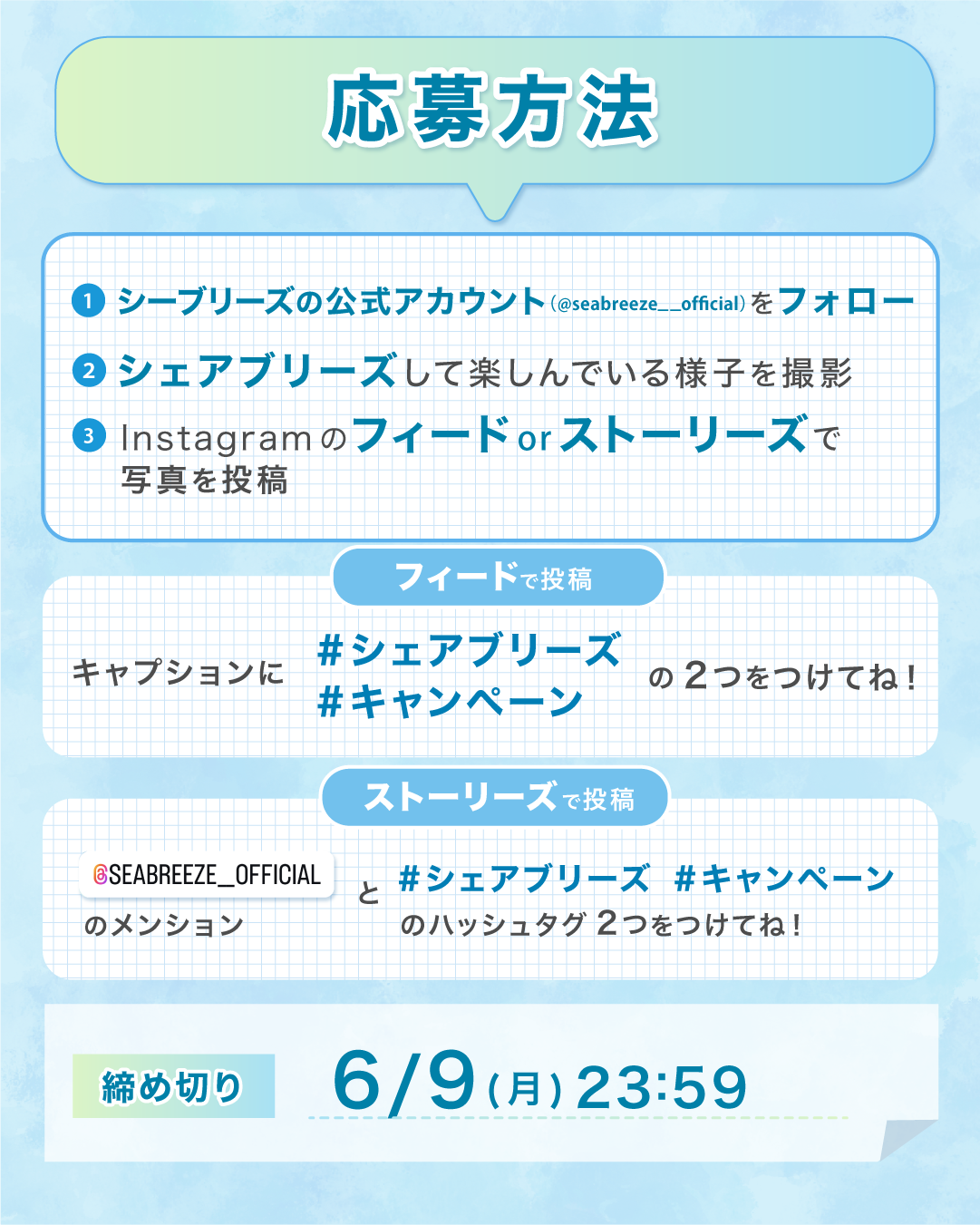 ストーリーズ投稿の場合は「@seabreeze__official」と「#シェアブリーズ 」「#キャンペーン 」をつけて投稿してください!