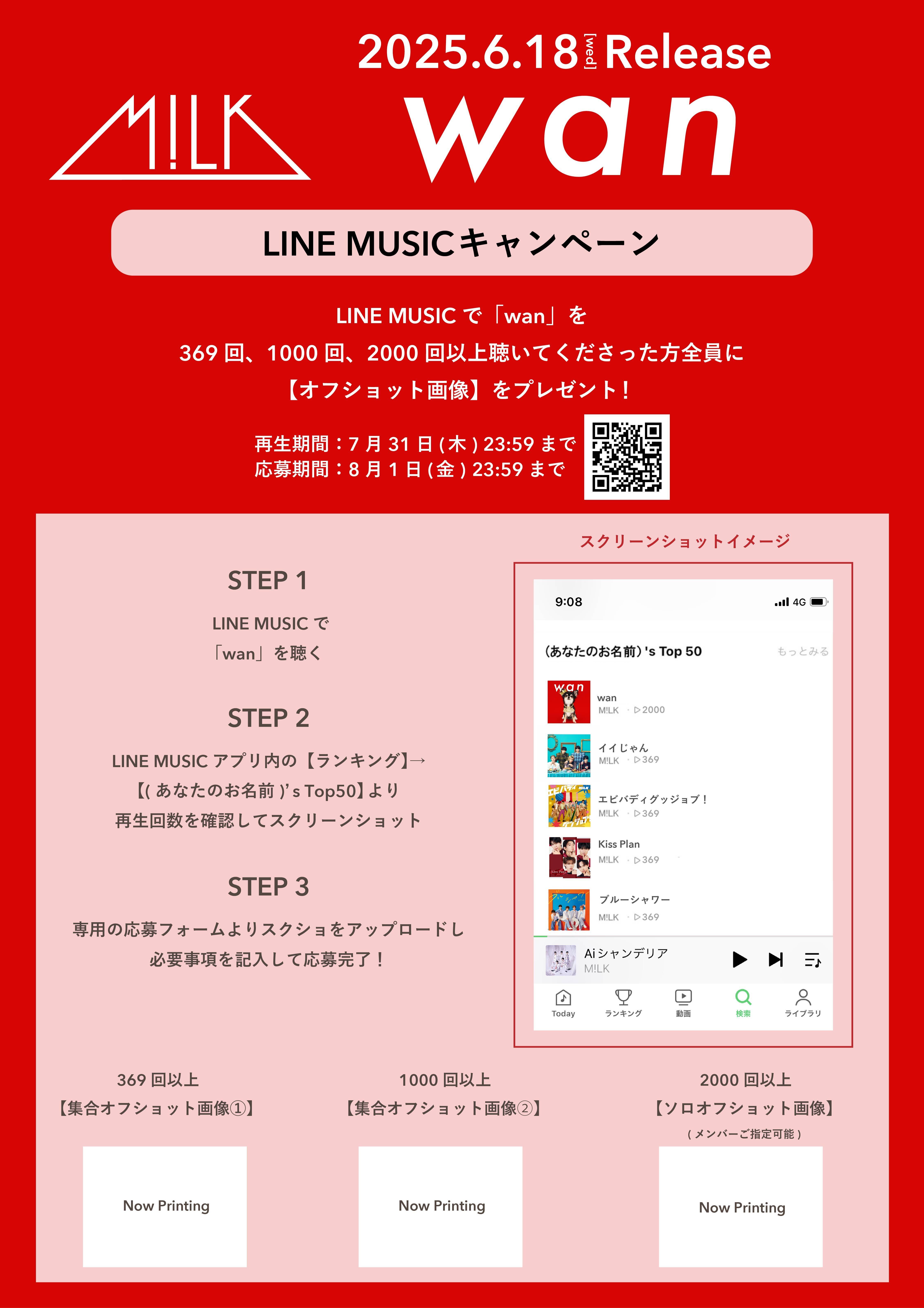 6月18日(水)のM!LK配信SG「wan」の配信スタートを記念して、LINE MUSIC再生キャンペーンが決定しました!