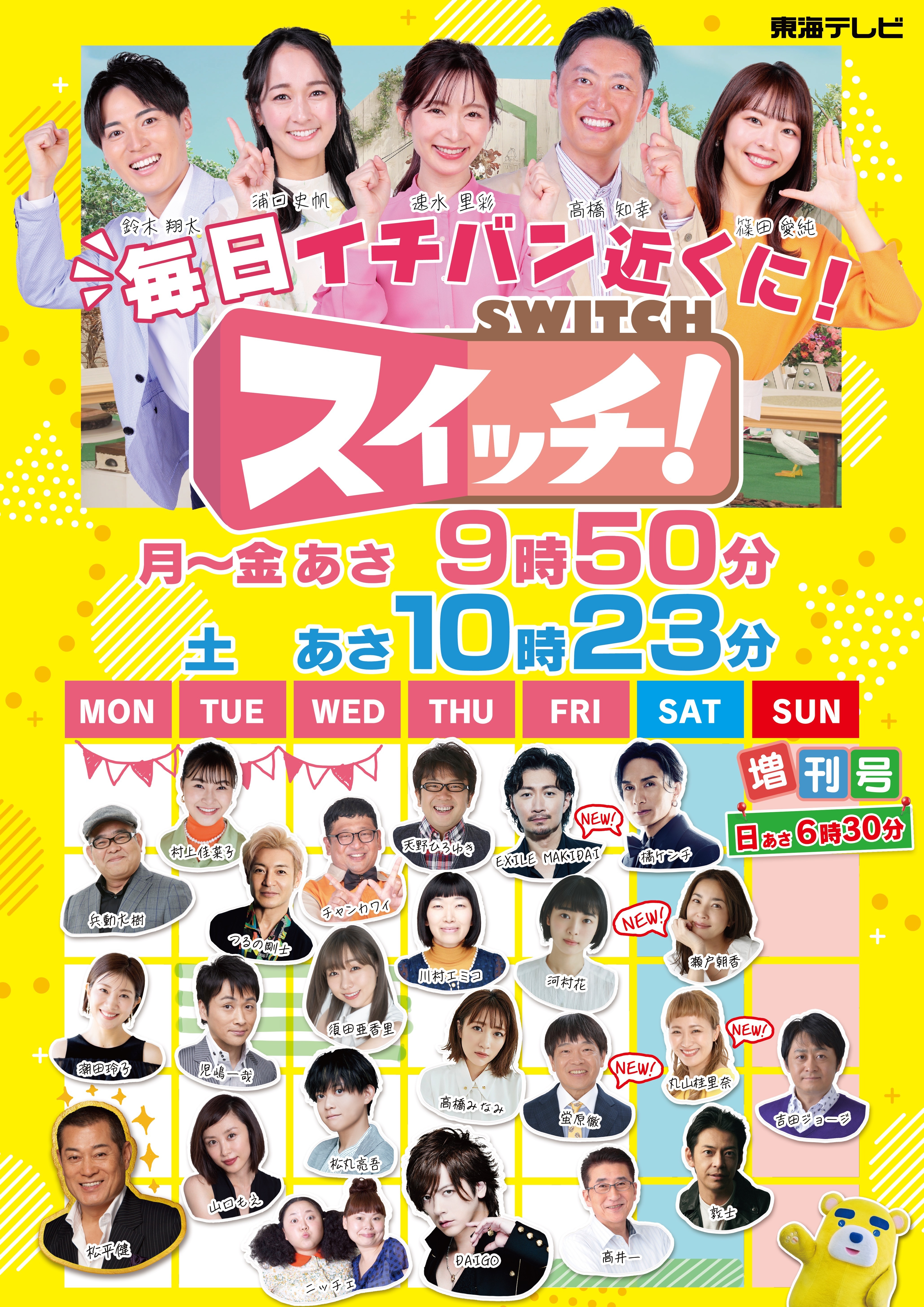東海テレビで平日あさに生放送している情報番組『スイッチ!』が、10 月 4 日から土曜のあさにも生放送することが決定しました。