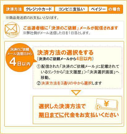 5)2018年2月11日 (日)23:59 までに支払方法を選択してください。その後、選択した方法で期日までに代金をお支払いください(選択した方法によって期日が異なります)。なお、決済手続きを行っていない場合、ご注文がキャンセルとなります。