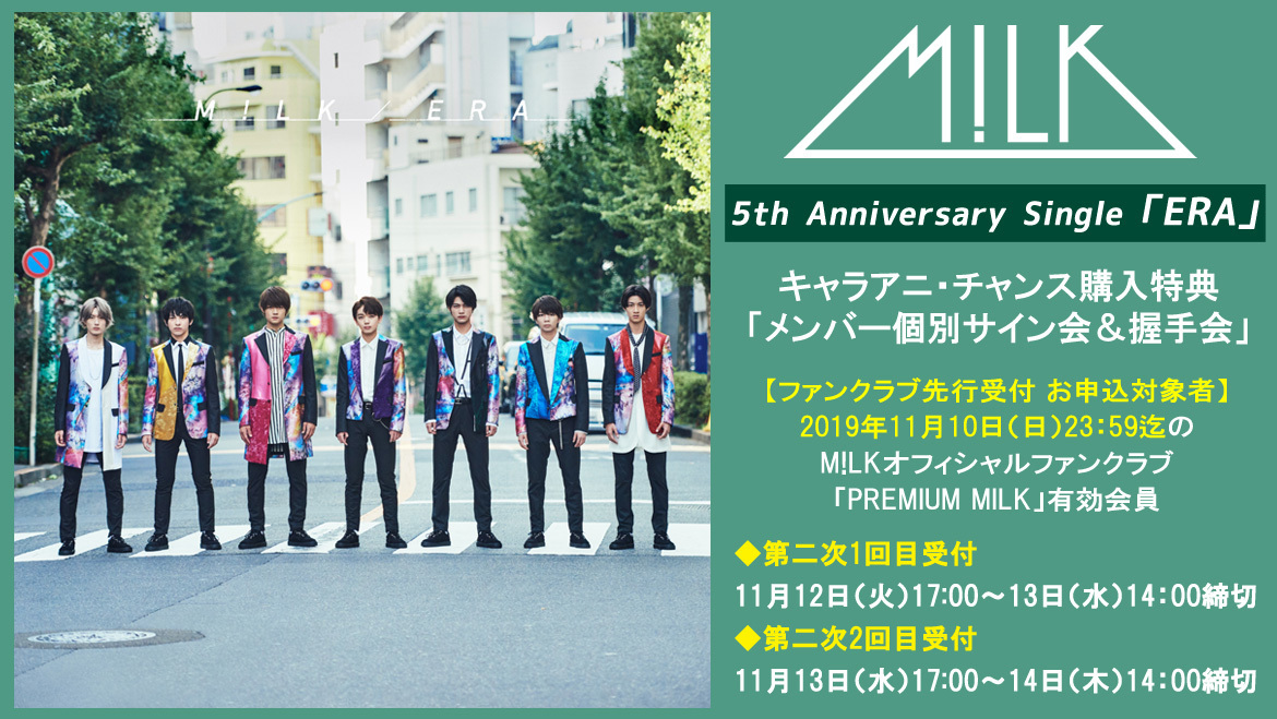 2019年11月6日(水)発売、M!LK 10thシングル『ERA』を通販サイト『キャラアニ・チャンス』で予約購入いただくと、「メンバー個別サイン会&握手会」参加券付きでお届けいたします。