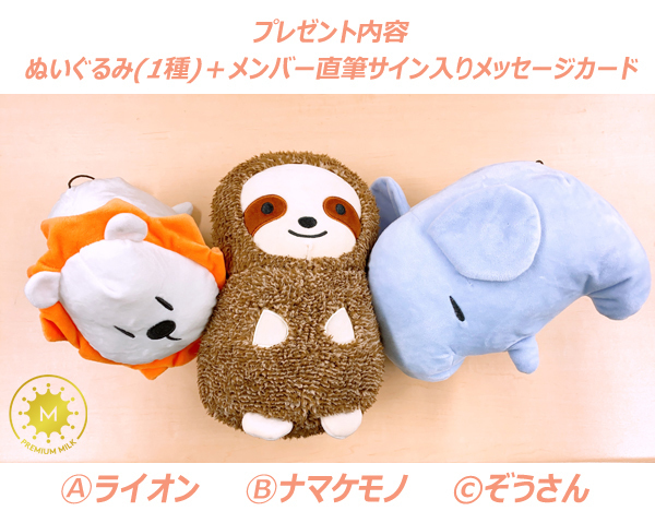 劇中のリビングシーンに何度か登場したシェアハウスの住人:ぬいぐるみ3種と、さらにM!LKメンバーから感謝の気持ちを込めて、世界に3枚だけのメンバー直筆サイン入りメッセージカードをセットにしてプレゼントさせていただきます。