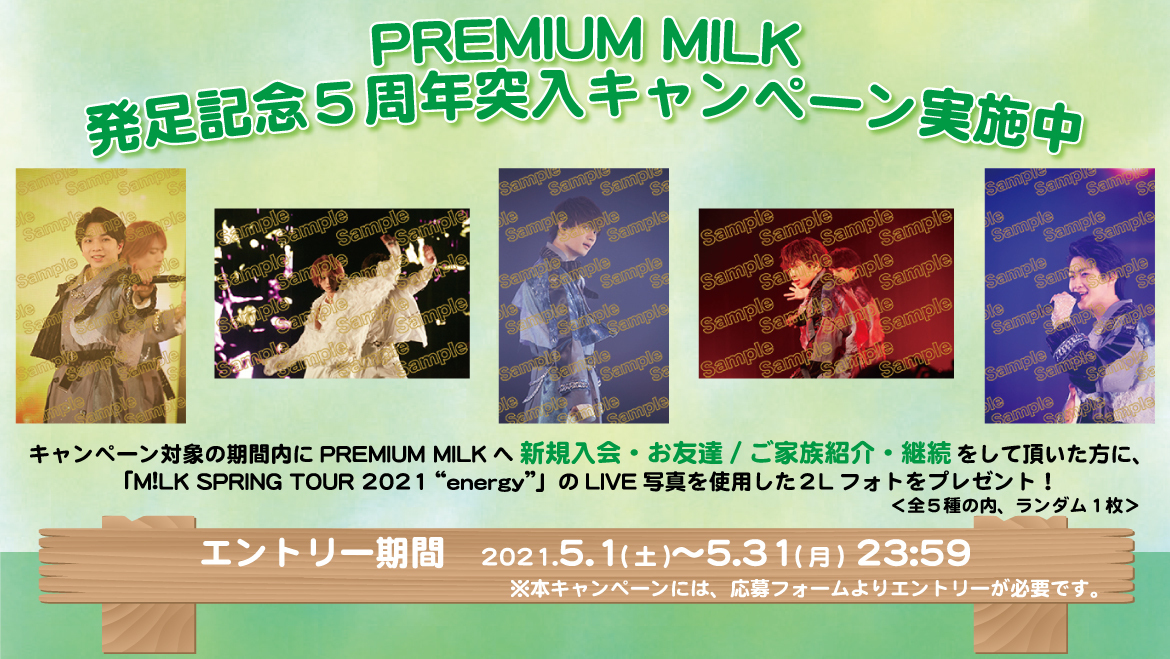 キャンペーン対象の期間内にPREMIUM MILKへ新規入会・お友達/ご家族紹介・継続をして頂いた方に、「M!LK SPRING TOUR 2021 “energy”」のLIVE写真を使用した2LサイズのPHOTOをプレゼント!(全5種のうち、ランダムで1種)