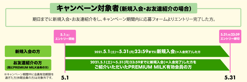 2021年5月1日(土) 〜5月31日(月) 23:59までに新規入会(=ご入金)のお友達を紹介して頂いた、PREMIUM MILK会員の方で、キャンペーン期間内に応募フォームよりエントリー完了した方。