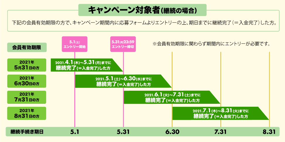 会員有効期限が2021年5月末日、2021年6月末日、2021年7月末日、2021年8月末日までの方で、キャンペーン期間内に、応募フォームよりエントリーの上、下記の期日までに継続完了(=入金完了)した方。