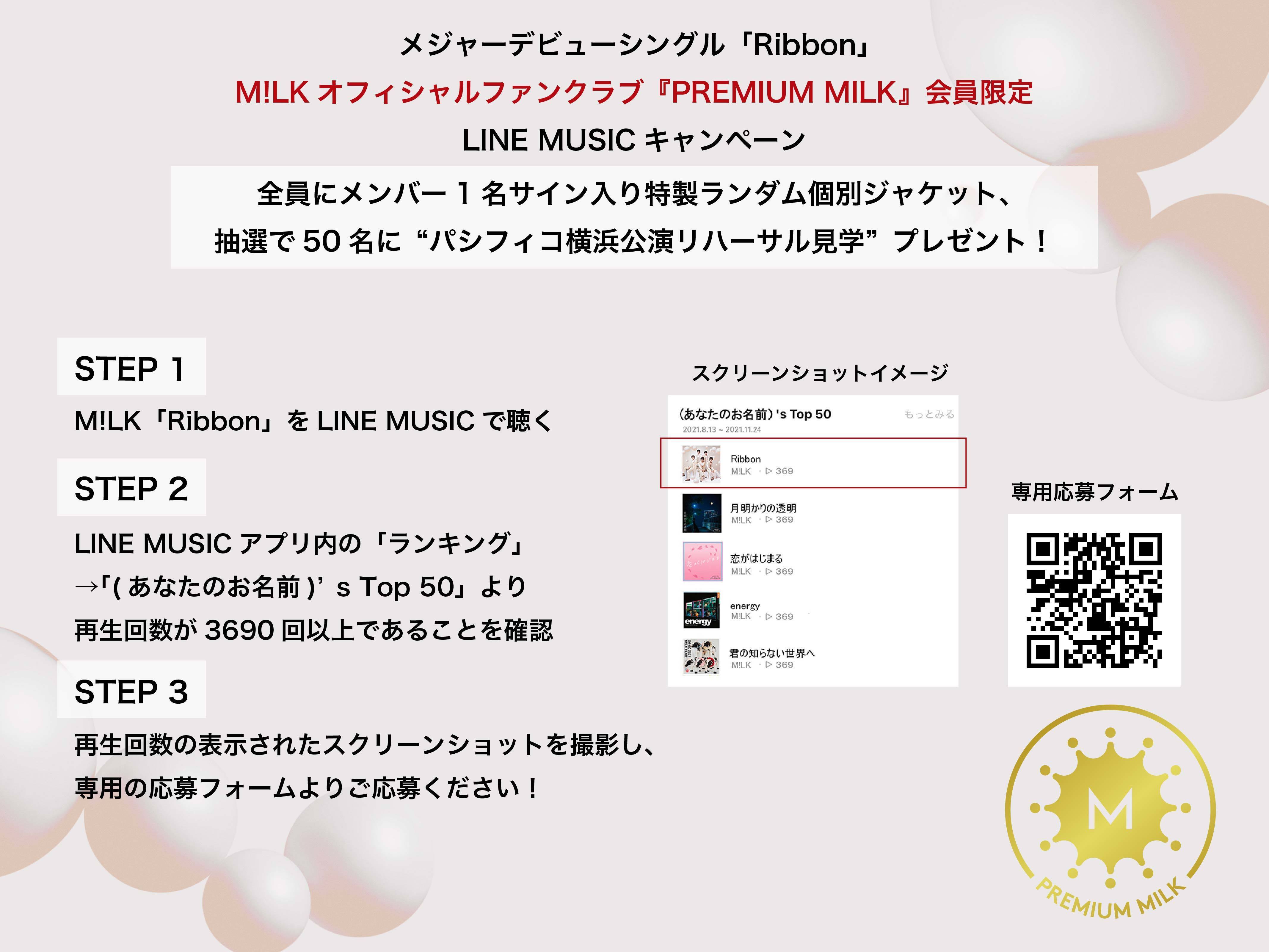 配信を記念して、M!LKオフィシャルファンクラブ『PREMIUM MILK』会員限定の、表題曲「Ribbon」LINE MUSIC 再生キャンペーンが決定しました!