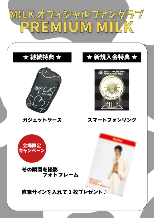 当日ファンクラブブースにて、新規入会もしくは、既存会員様からのご紹介で新規入会いただくと、ご入会者様と既存会員様それぞれに『その瞬間を撮影フォトフレーム』1枚と『PREMIUM MILK オリジナルトートバック』をプレゼント!
