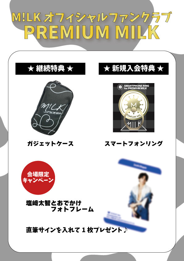 当日ファンクラブブースにて、新規入会もしくは、既存会員様からのご紹介で新規入会いただくと、ご入会者様と既存会員様それぞれに『塩﨑太智とおでかけフォトフレーム』1枚と『PREMIUM MILK オリジナルトートバック』をプレゼント!