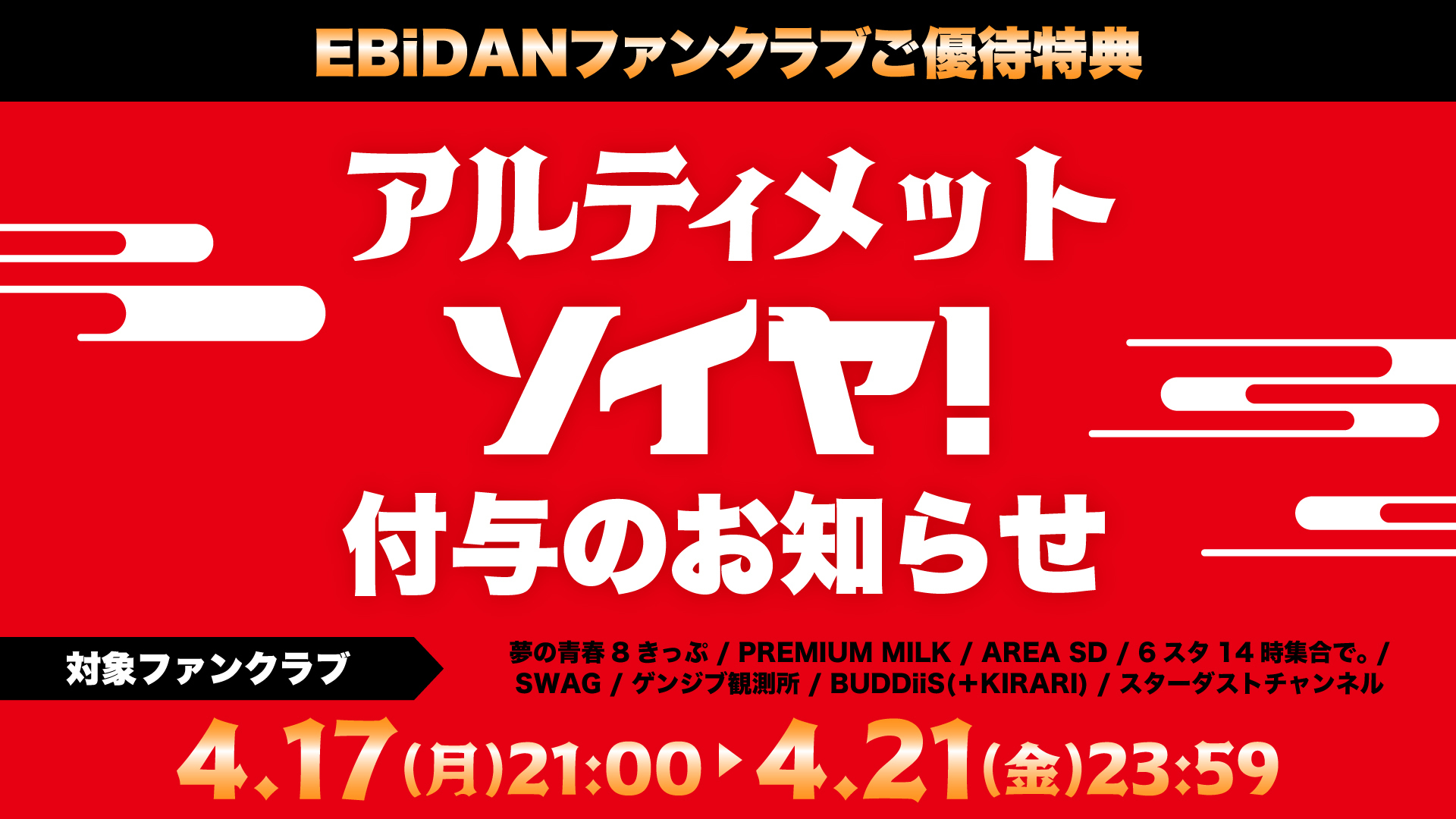 本キャンペーンに特別加算される、EBiDANファンクラブ会員様限定“アルティメットソイヤ!”についてのお知らせです。