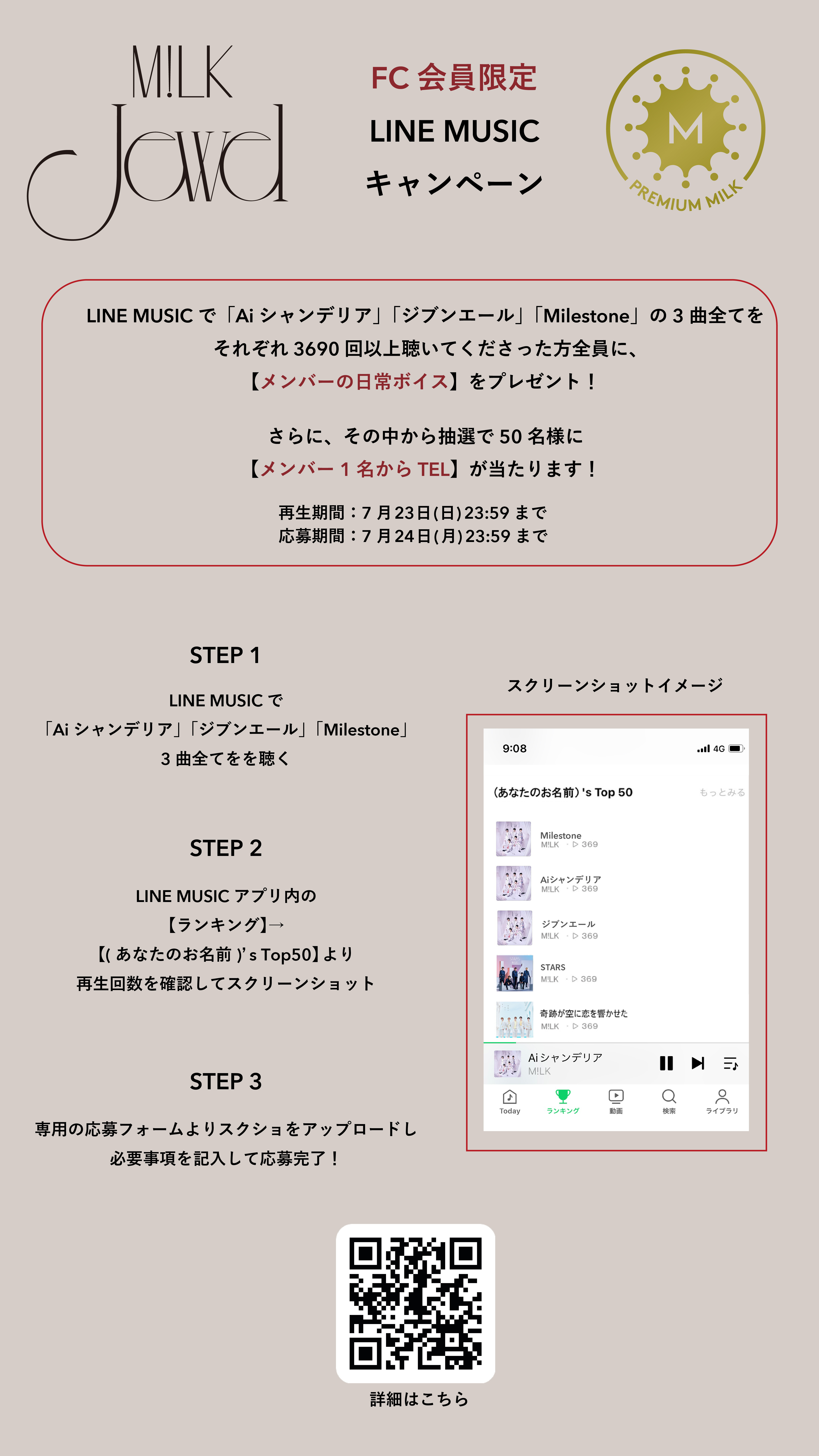 配信を記念して、M!LKオフィシャルファンクラブ『PREMIUM MILK』会員限定の、『Jewel』LINE MUSIC 再生キャンペーンが決定しました!