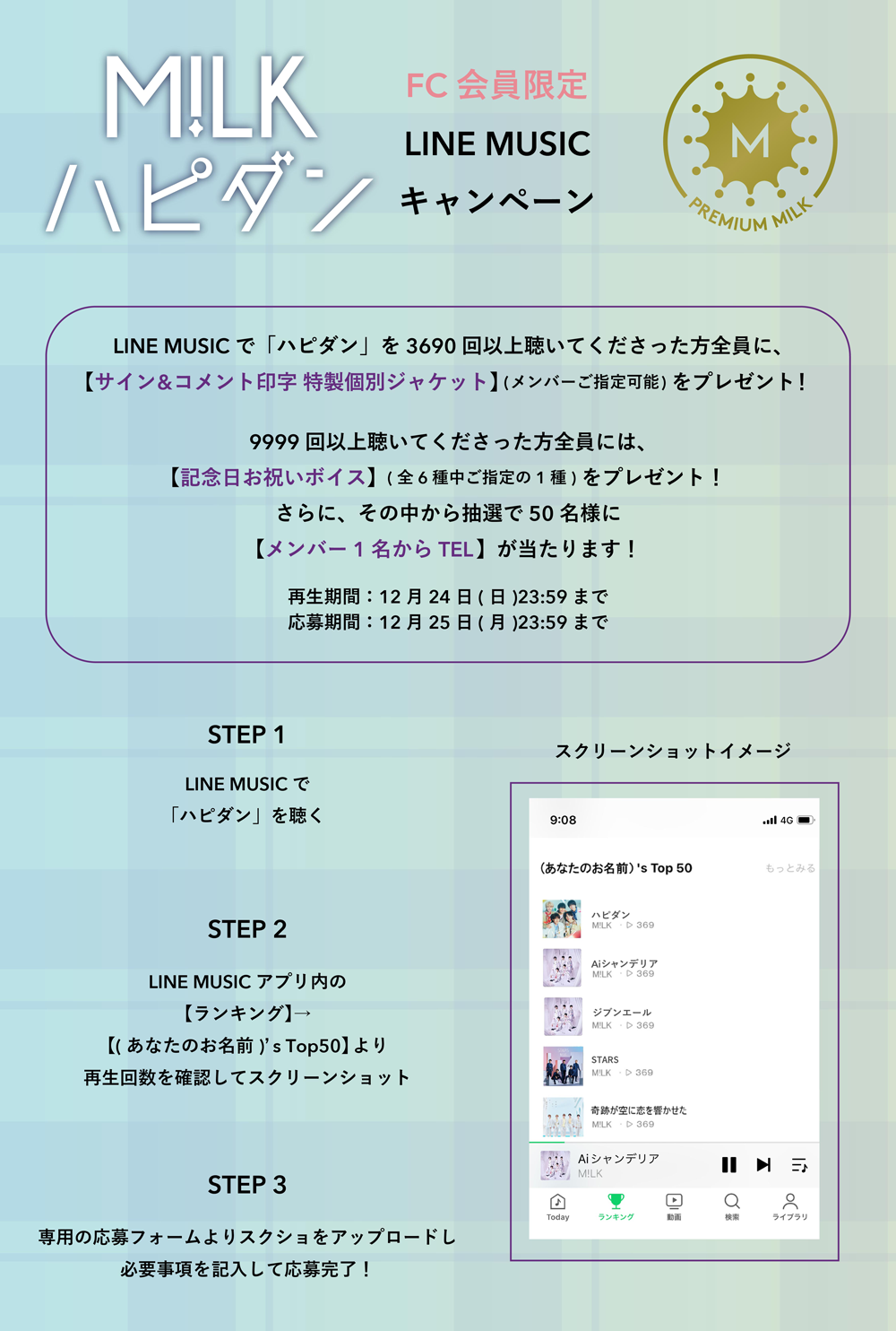 配信を記念して、M!LKオフィシャルファンクラブ『PREMIUM MILK』会員限定の、「ハピダン」LINE MUSIC 再生キャンペーンが決定しました!