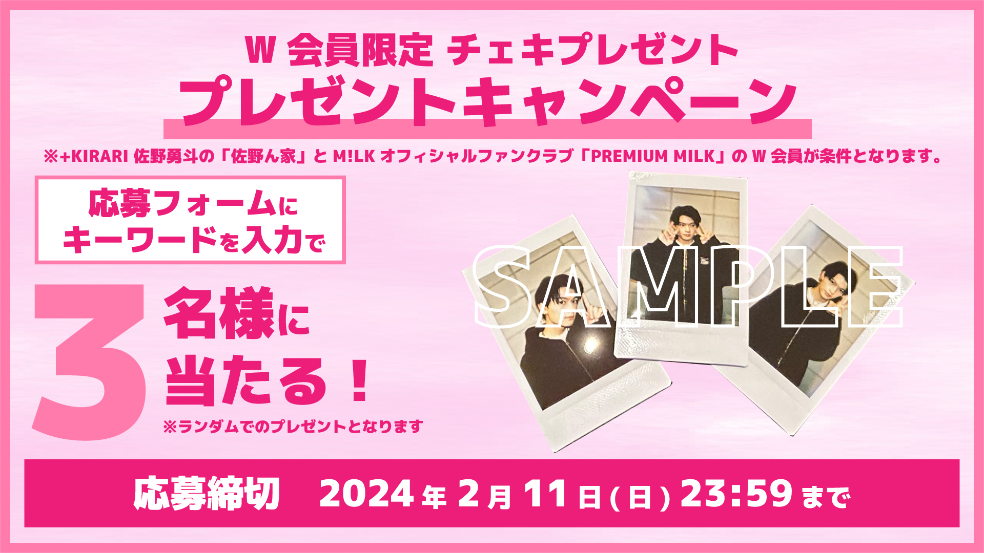 +KIRARI 佐野勇斗の「佐野ん家」に投稿されたプレゼント企画の記事に記載されているキーワードとM!LKオフィシャルファンクラブ『PREMIUM MILK』内コンテンツ【スタッフは見た!】vol.4に記載されているそれぞれのキーワードを入力していただいたW会員様の中から抽選で限定チェキをプレゼント!!