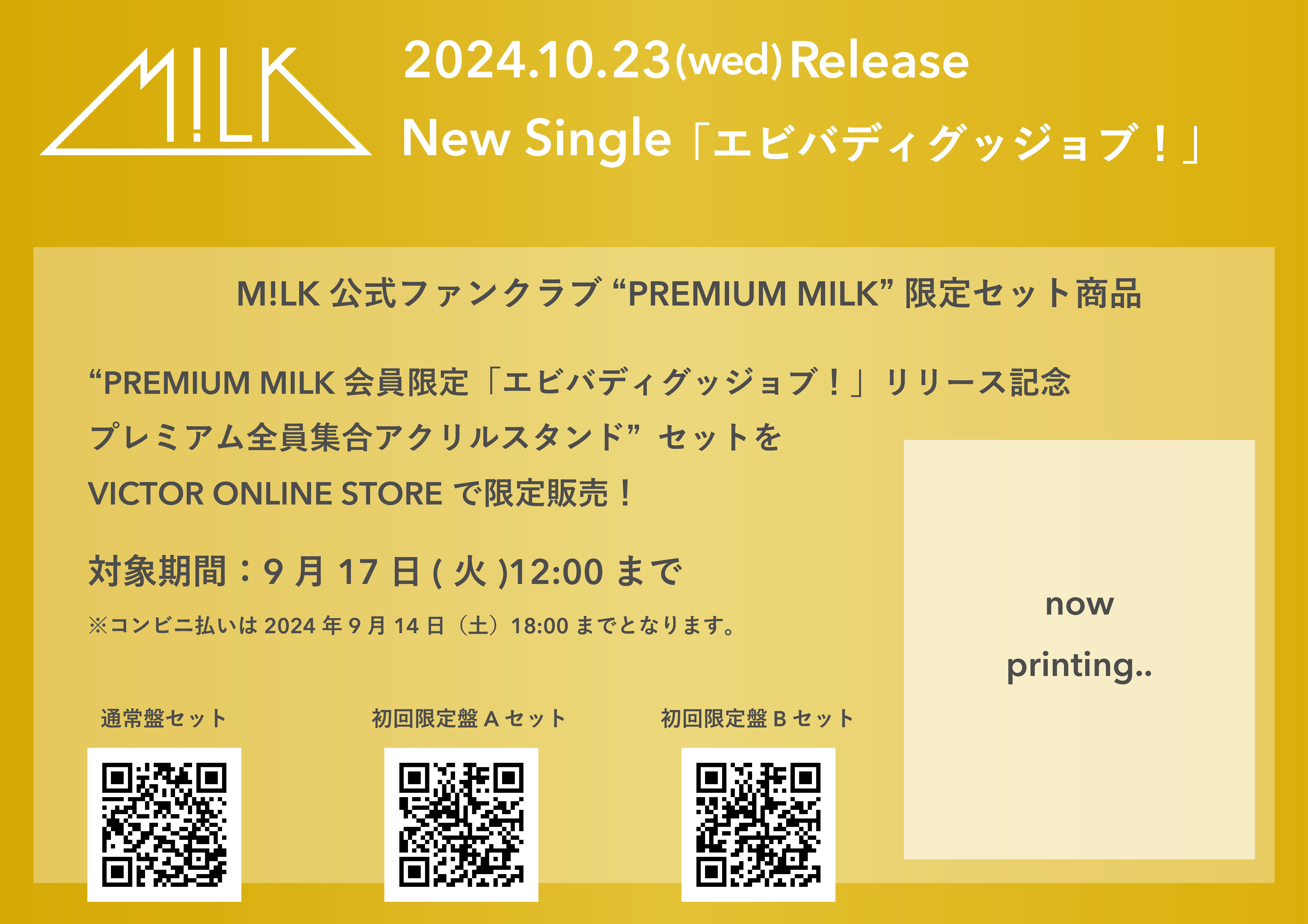 M!LKオフィシャルファンクラブ ”PREMIUM MILK” に入っている方限定に、”PREMIUM MILK会員限定「エビバディグッジョブ!」リリース記念 プレミアム全員集合アクリルスタンド”のセット商品をVICTOR ONLINE STOREにて販売いたします。期間限定ですので、お早めにご予約ください。