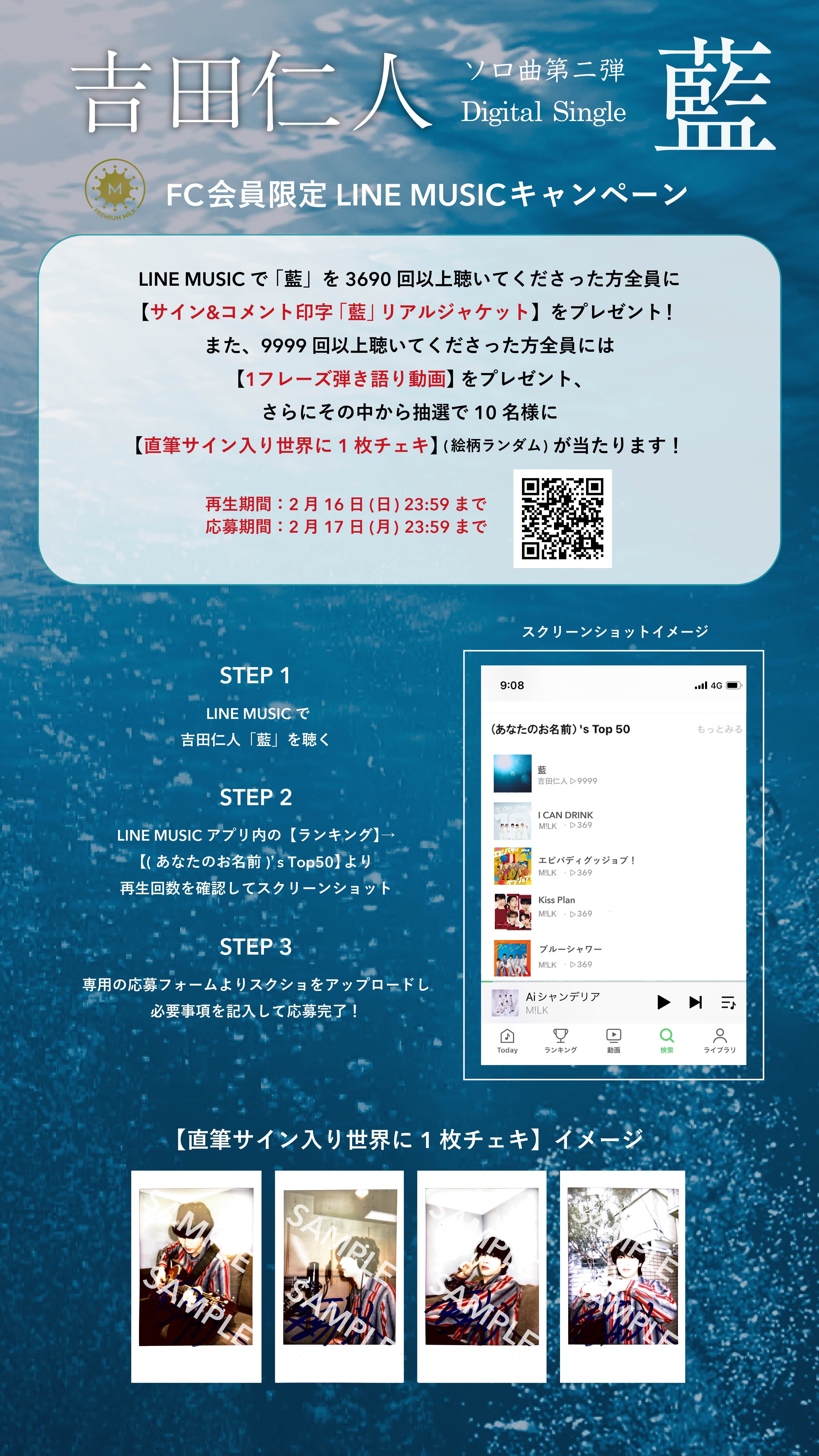 1月15日(水)の吉田仁人「藍」の配信スタートを記念して、M!LKオフィシャルファンクラブ『PREMIUM MILK』会員限定の、「藍」LINE MUSIC再生キャンペーンが決定しました!
