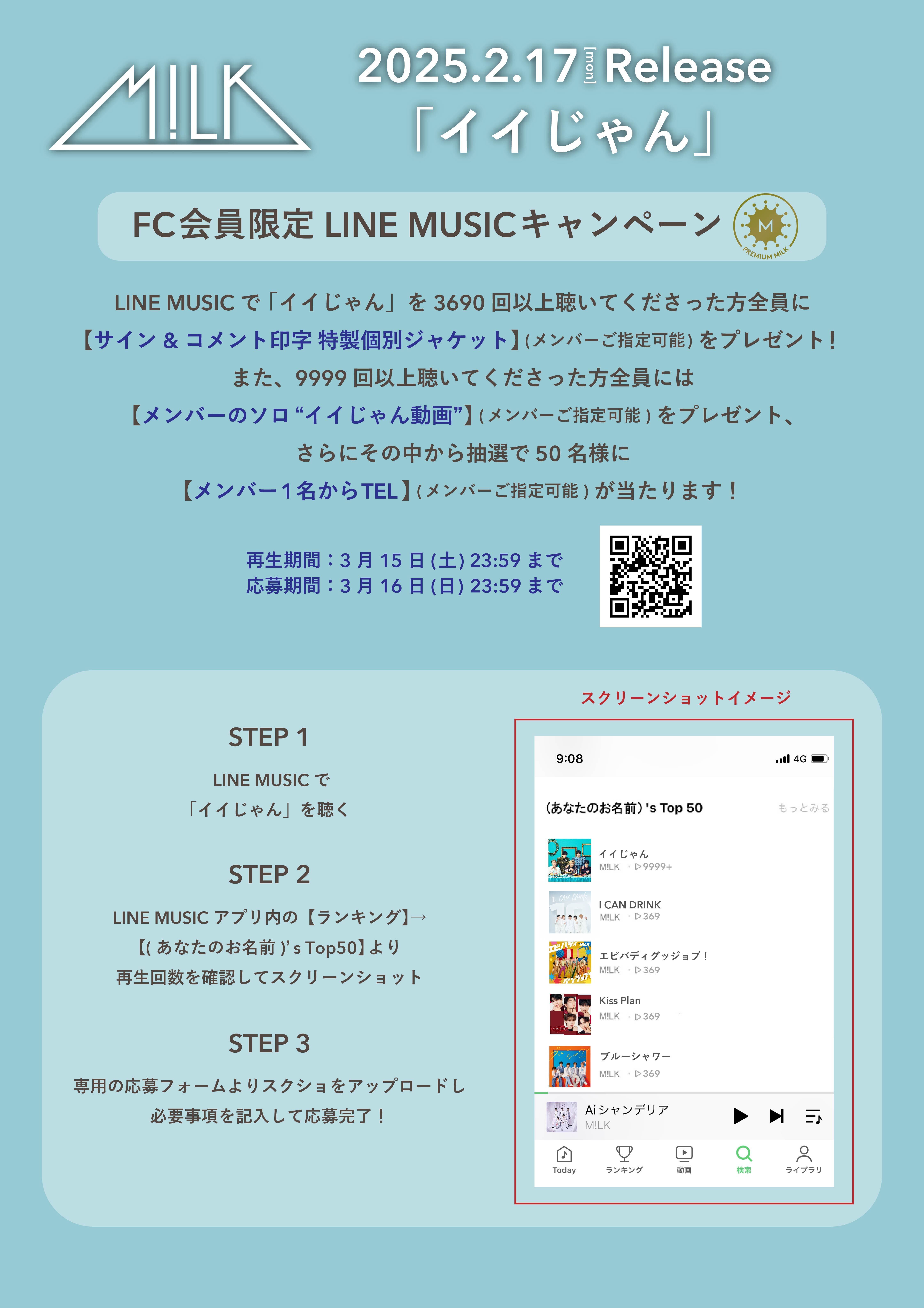 2月17日(月)のM!LK「イイじゃん」の配信スタートを記念して、M!LKオフィシャルファンクラブ『PREMIUM MILK』会員限定の、「イイじゃん」LINE MUSIC再生キャンペーンが決定しました!