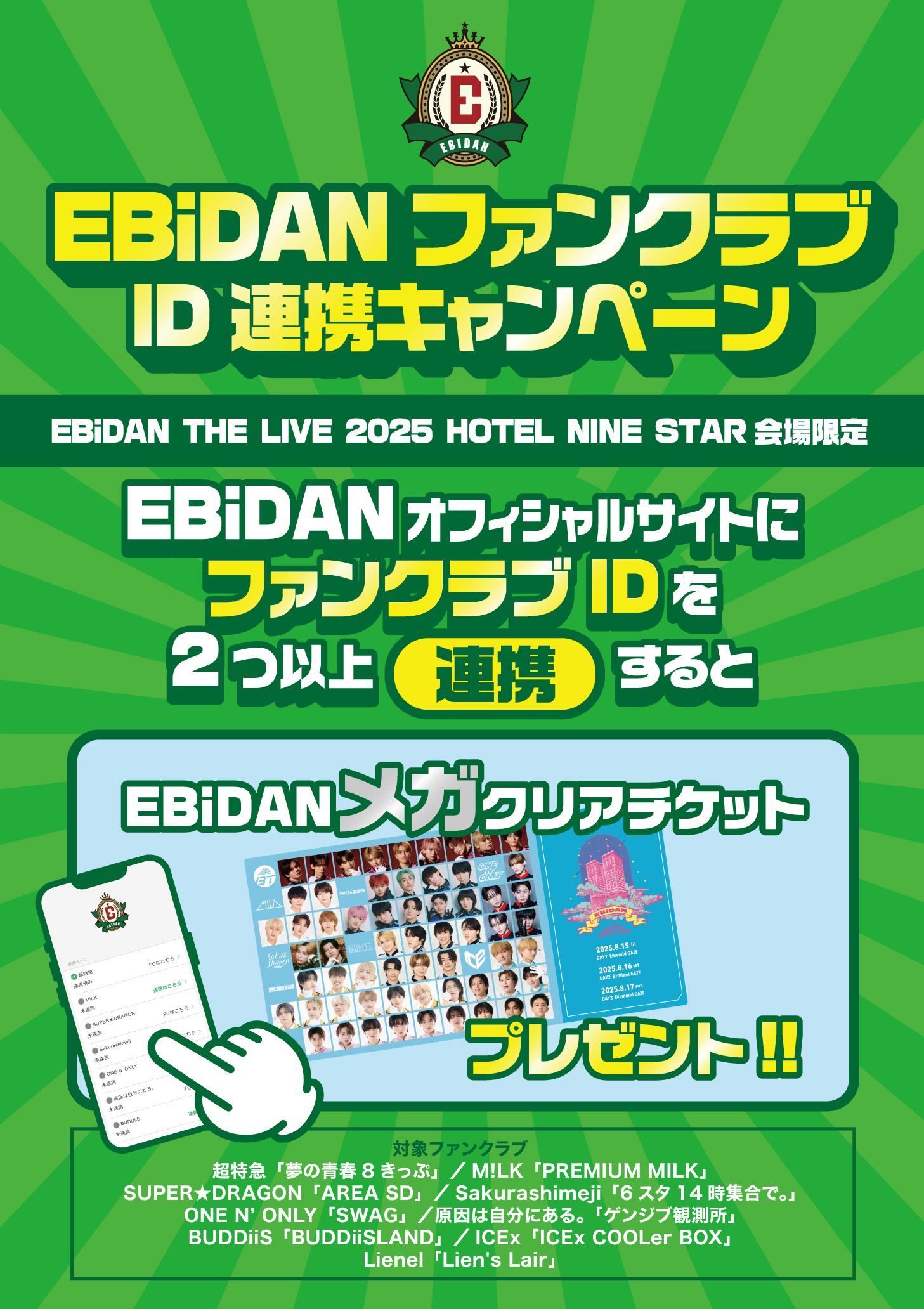 8/15(金)・8/16(土)・8/17(日)「EBiDAN THE LIVE 2025 HOTEL NINE STAR」にて、EBiDANオフィシャルサイトと、ご入会中のグループファンクラブ2つ以上を連携されている方限定で、ファンクラブブースにお越しいただいた方に『EBiDAN MEGA CLEAR TICKET<絵柄1種>』をプレゼントいたします!