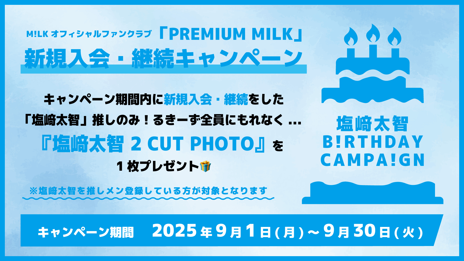 9月11日の塩﨑太智のお誕生日を記念して、M!LKオフィシャルファンクラブ「PREMIUM MILK」新規入会・継続キャンペーンを実施いたします!