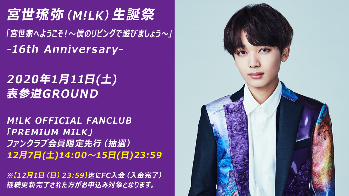2020年1月11日(土)表参道GROUNDにて、M!LKオフィシャルファンクラブ「PREMIUM MILK」会員限定の宮世琉弥 生誕祭 『宮世家へようこそ!〜僕のリビングで遊びましょう〜』の開催が決定しました!