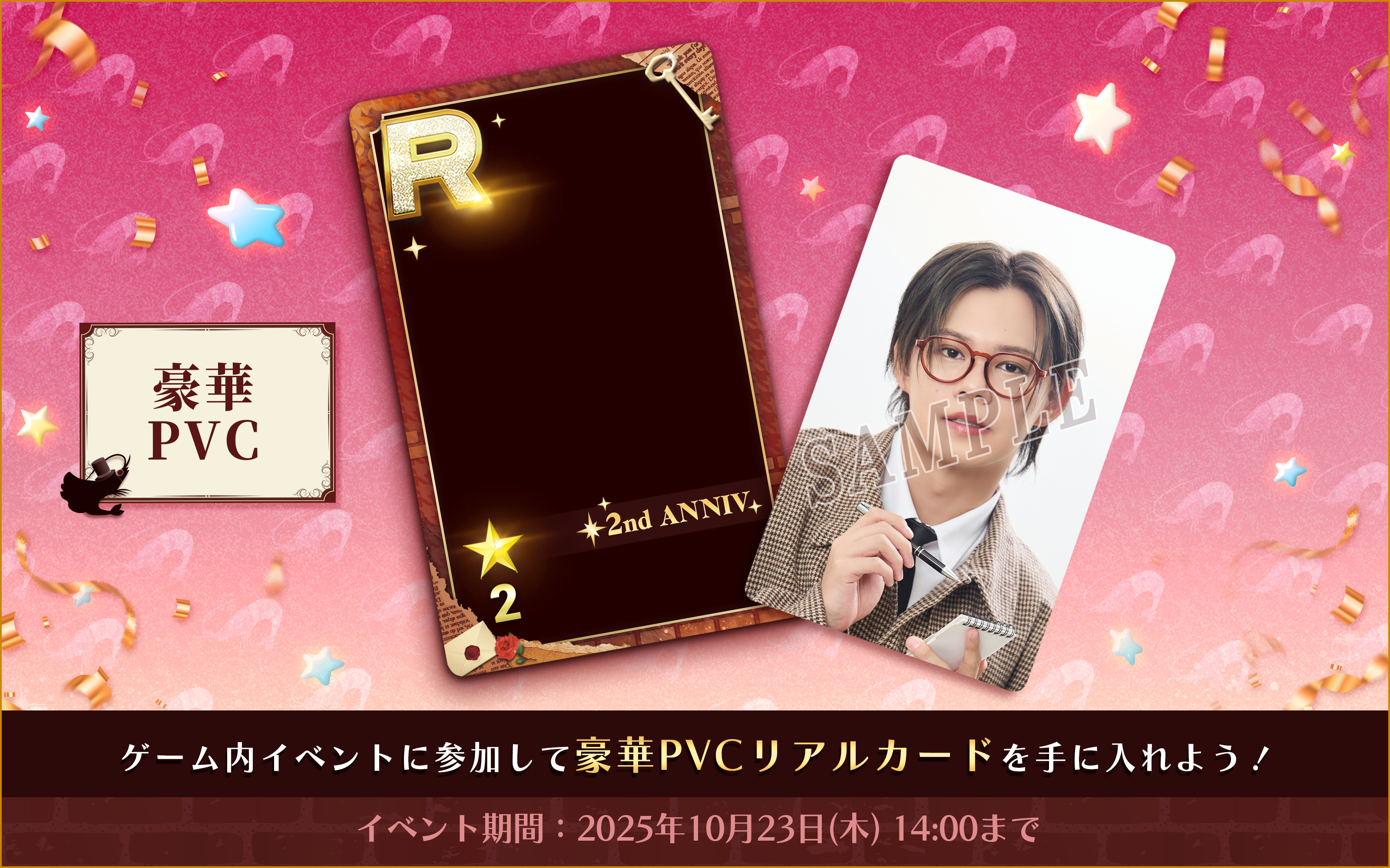 今回のリアルカードは、高級感あふれるプラスチック(PVC)素材を使用した、キラキラと輝く2周年特別仕様の限定デザインです。